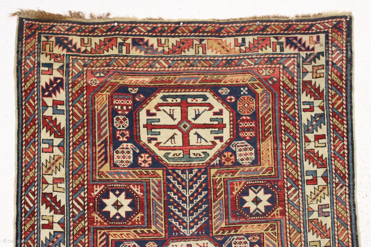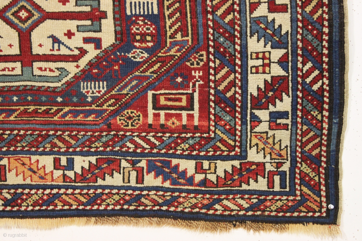 antique caucasian rug, probably shirvan, in pretty good condition with extra long keyhole style medallion and many charming animals. Overall fair even pile with good edges and ends. All good saturated natural colors. a small sewn up side tear and an old small repair or two. Reasonably clean. All in all very attractive, quite presentable and usable tribal weaving. ca. 1880. 3'11" x 7'7"
