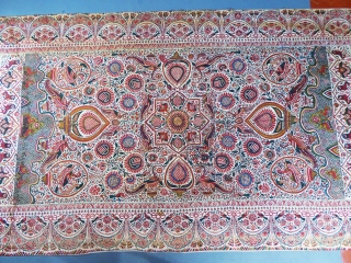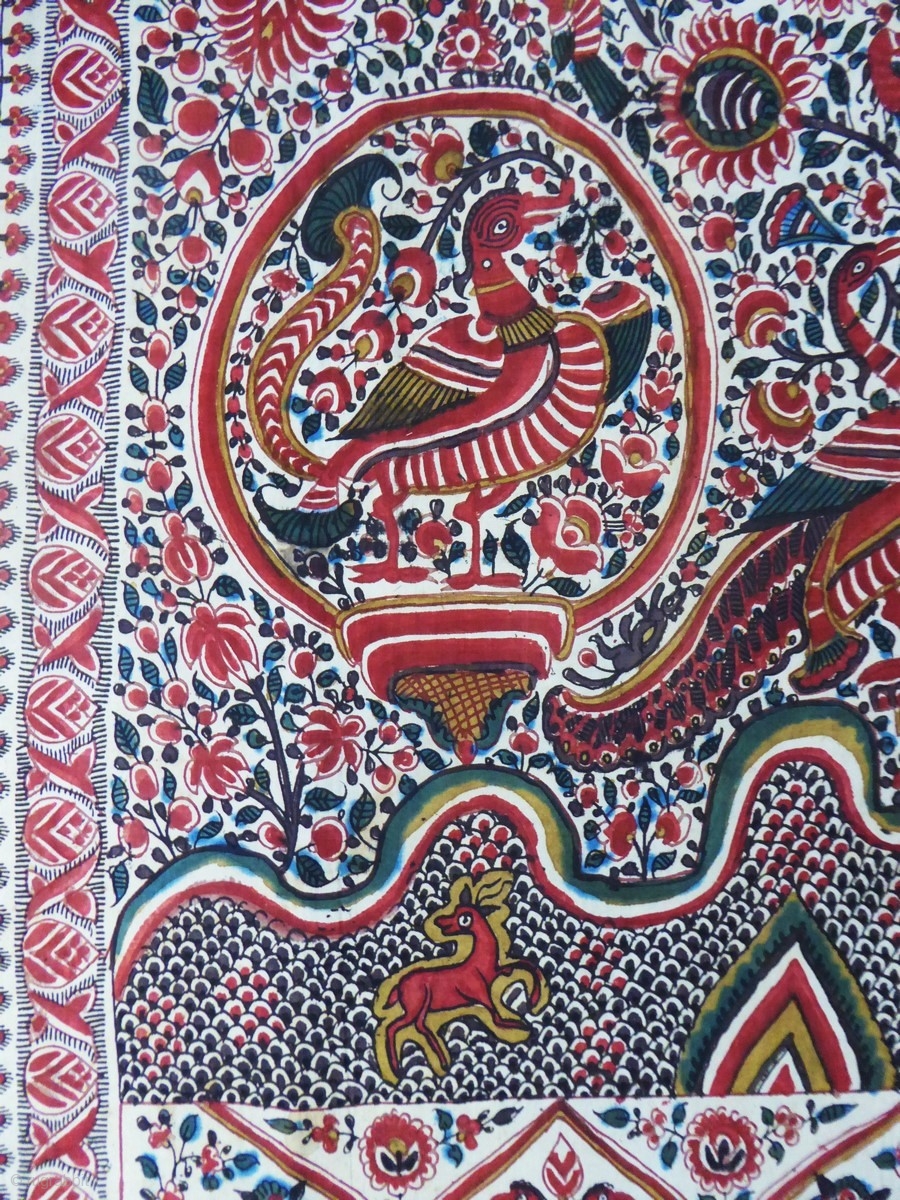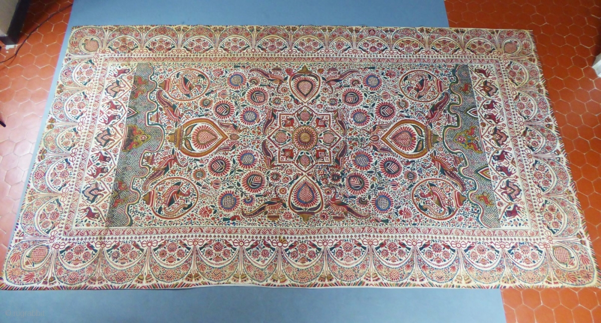 India for export to Europe. Rich floral and figures repertoire with large central rosette. Flowers, pomegranates, peacocks, birds of paradise, scales compose a rich decoration marked by the manual layout of the Indian craftsman. The borders with pompoms and friezes are inspired by a European decor. Palampore lined with a modern linen fabric to ensure its good conservation. Excellent condition of color and conservation.
