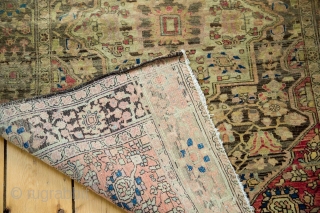 Farahan Sarouk, 1910. No cracking, supple for the type. Mostly intact sides and ends. Even to low pile with knot heads. 3'2" x 4'8". Contact for more info.