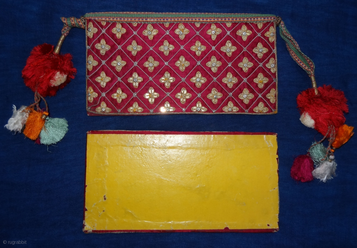 Jain Book Cover with cotton and Silk Tassels,Silver(Real) And gold(Real)gilt embroidery on the Gajji-Silk,.From Kutch,Gujarat. India.C.1900.Its size is 14X26cm,Inside Embroidered Broad size is 13cmX26cm(DSC02411 New).