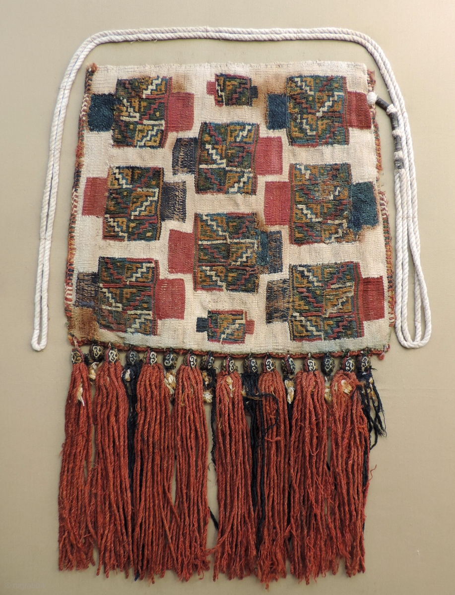 Pre-Columbian Coca bag, (Chuspa). a.d. 1000 - 1400. Unusual white ground ceremonial coca bag from the Chuquibama culture of Southern Peru. Size: 15 x 10 inches. Professionally conserved. Mounted size: 16 x 20 inches. Tapestry weave. Alpaca Fiber. White grounded textiles from Chuquibamba are not often seen.