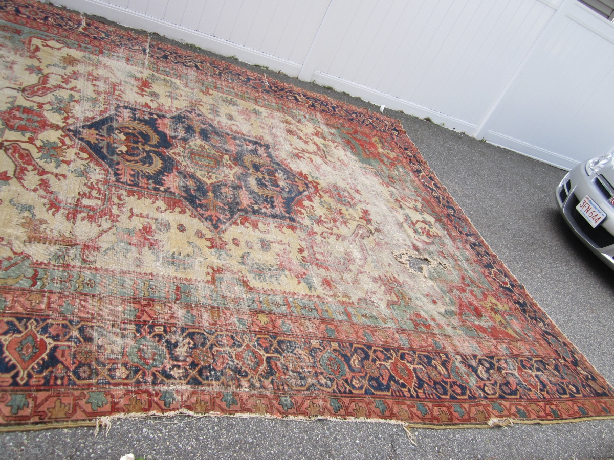 antique oversize serapi heriz rug worn condition beautiful colors has been cleaned no dry rot 2 big holes and 3 tear in one side easy restoration for huge profit measures 11' 7" x 14' 10" soldddddddddddddddddddddd