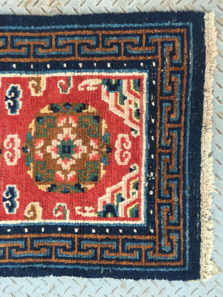 Tibet rug, red color, three medallions flower pattern around lucky cloud veins. good colors and condition, good age , 4 rows of knots rewoven at one end. Size 133*73cm(52*28")