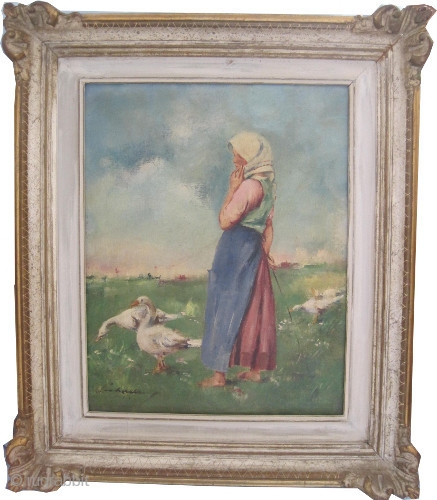 European oil paining (Hungar ?), 1870 Antique, museum standard, collector's item, good condition and signed.Size: 60 x 70 (cm) 2' x 2' 4" carpet id: fp-2