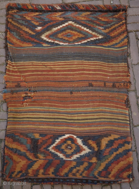 Bakhtiari double bag with kilim backside. The backside is as beautiful as the front. The bag might be made by a mother and daugther, one part is made by an experienced weaver, the other by a 'student'. It has been used, and has some injuries and restaurations( see pictures) 102 x 70 cm.