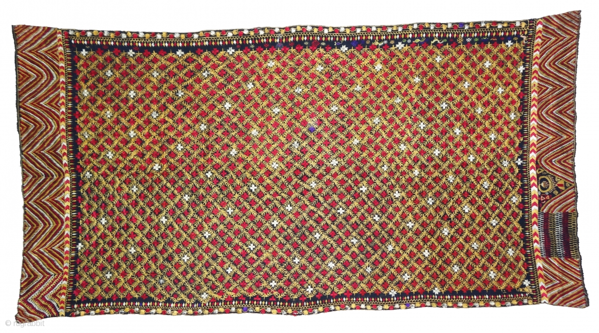 Indigo-Colour Phulkari From East(India)Punjab Region of India. India.Silk on Indigo Dyed Hand Spun Cotton ground.Showing the Rare Influence of Jewelry Figure Dancing Peacock and Birds.C.1900.Its size is 124cmX245cm(DSC05632).