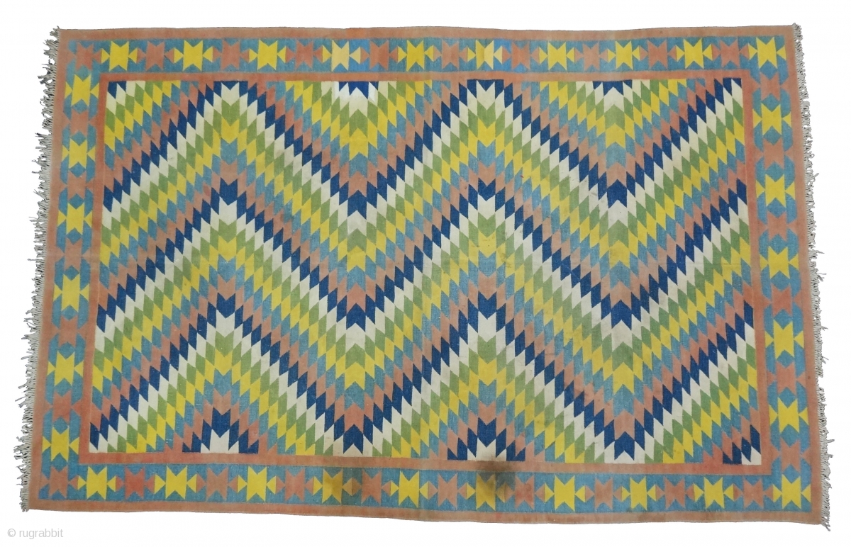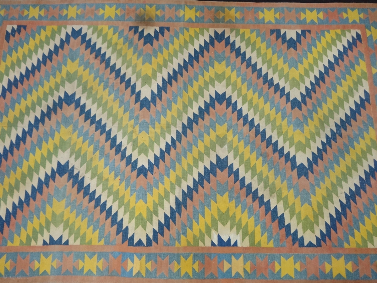 Satrangi-Shatranji (Seven-Colours),Jail Dhurrie(Cotton)Blue And Multi Colour Lahariya Weave Design Dhurrie with Star Design in the Border.From Bikaner, Rajasthan. India.C.1900.Its size is 132X205cm. Condition is very good(DSC05832).