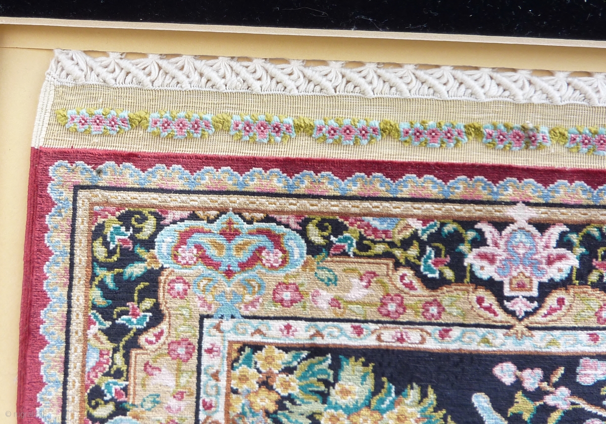 Fine 15 x 15 knts. p/cm. silk on silk Hereke, signed Özipek in its original frame, Seize frame: 60 x 47 cm., Seize rug: 34 x 26 cm. Mint untouched condition.