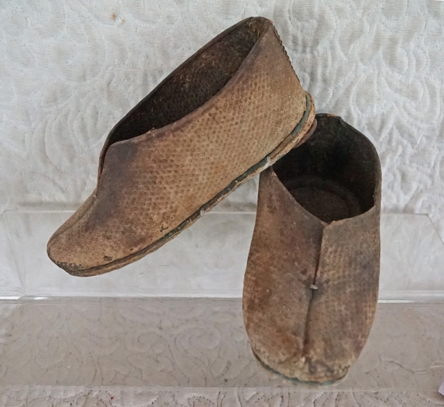This old pair of boys well worn field shoes are from Southern China...They are stiff with age and exposure to water and mud...8 inches long