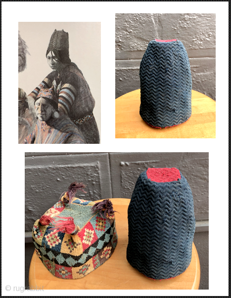 Pre-Columbian knotted headdress, Arica, Faze Cabuza, Tiwanaku period - a.d. 300 - 1,100. This is an unusually small (miniature-like) hat with ribbed chevron pattern. It is a rare type of four cornered hat from Northern Chile. This piece is unusually small for the type. It measures approximately 7 inches tall x 4 inches in diameter and the red top section is 2 inches square. Its size suggests it was made for an infant or as a ritual headdress for an idol. The few such hats I've seen over the years have all been quite a bit larger than this example. Several examples of this chevron patterned hat type are published and reside in the Museo Chileno de Arte Precolumbino, Arica Chile. They tend to be made in either brown and red or blue and red coloration like this piece. The beautiful, classic Wari four-cornered pile hat shown here for scale is also available for sale.