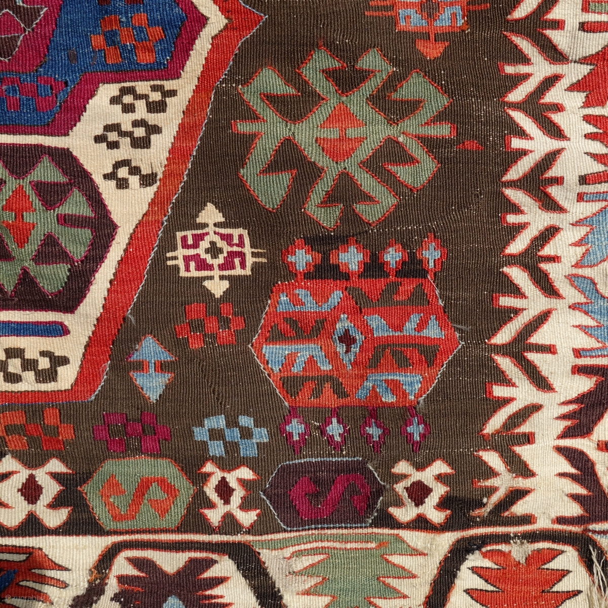 Antique Nigde kilim, mid to last quarter of 19th century, 350X160cm. Fabulous, saturated colours, lustrous wool. Alas it has been cut in the middle to be used as 4 fragments, some tiny old repairs. The fringes are not original.