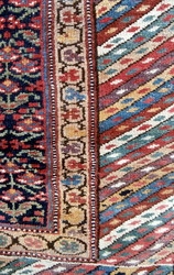 antique kurdistan long rug circa 1900. The warps and wefts are of fine two ply hand spun wool and this allows for a very fine knot density, weight and durability and fineness of design. The colour palette is rich and varied and the rug when ruckled displays a deep sheen. The condition is excellent and the only loss is of a few rows of knots in the bottom border which has been properly secured. The top border still has its embroidered kilim end. There is extensive use of natural camel hair in the borders and some designs. This is an outstanding long rug. Reference 2962. Size 418 x 95 cms., or 13ft. 8ins. x 3ft. Euros 1450.