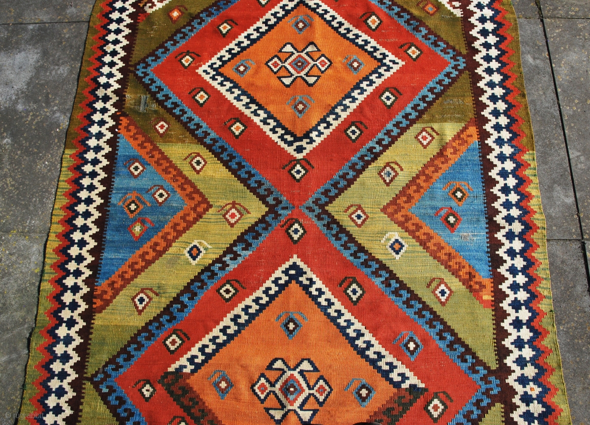 Qashqai kilim with strong graphics and excellent saturated colors. Size 148 x 270 cm/ 59 x 108 inches. Generally in very good condition, only one tiny hole in a kilim end, a small restoration at one border and one small area with wear.
