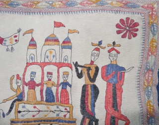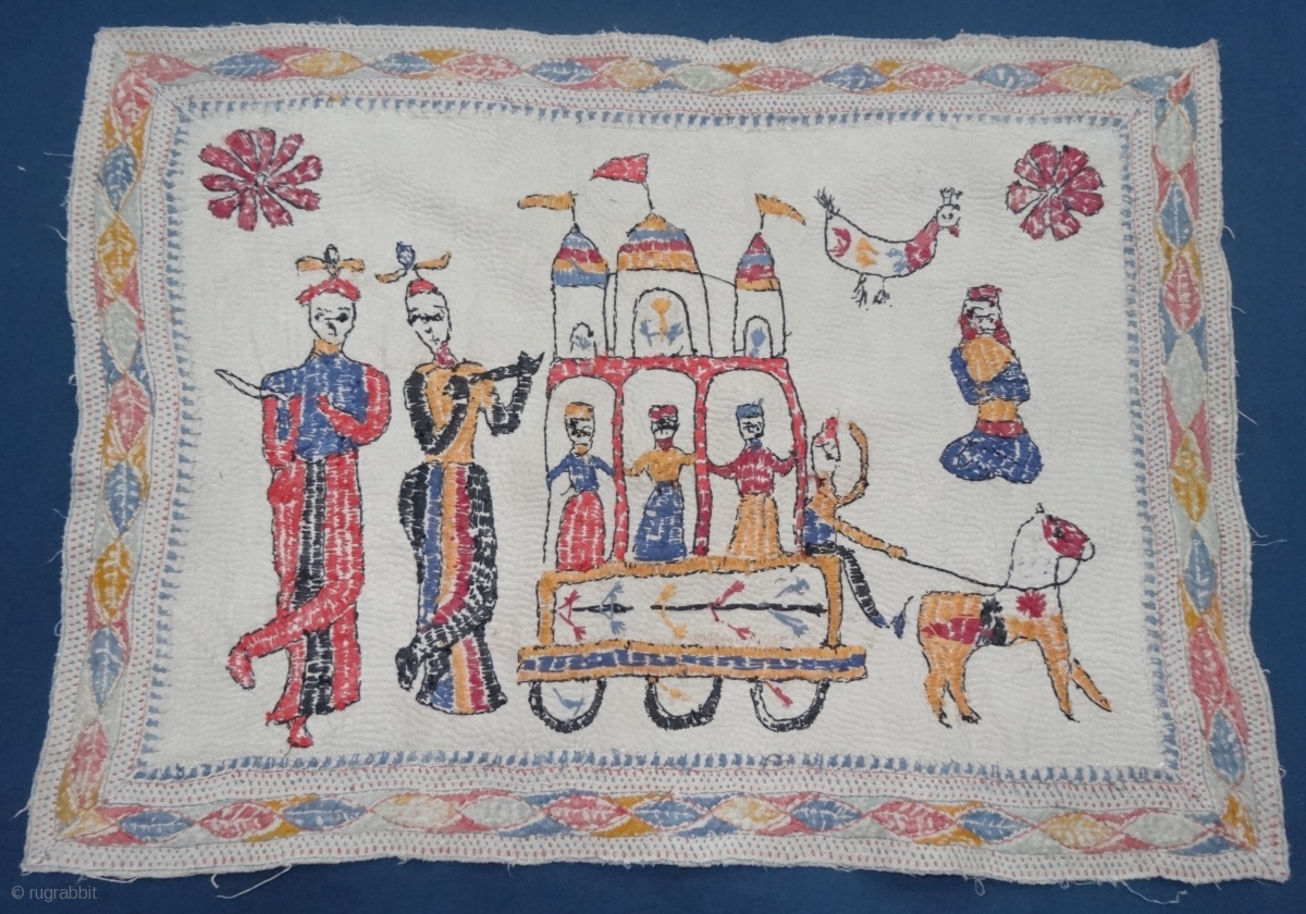Folk Kantha Quilted and embroidered cotton Kantha Probably from West Bengal region of India, India. Its size is 34cmX46cm.Showing the Folk style of Rath-Yatra from Jagnath Puri(20191220_142054).