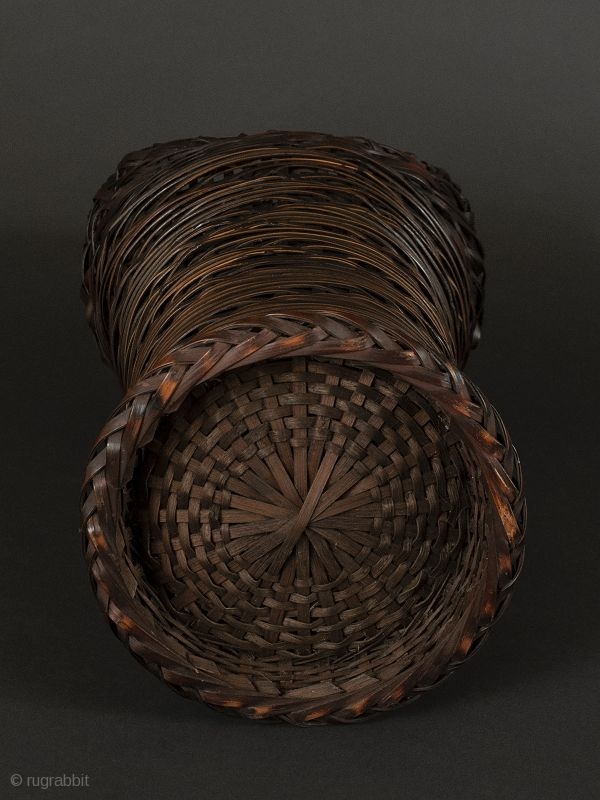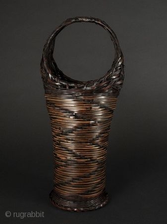 Japanese antique bamboo basket, tall narrow shape with circular handle. Design on body of zigzag alternating dark woven bamboo on lighter woven material. Ending in circular flattened foot. Interior bamboo container. Good condition.