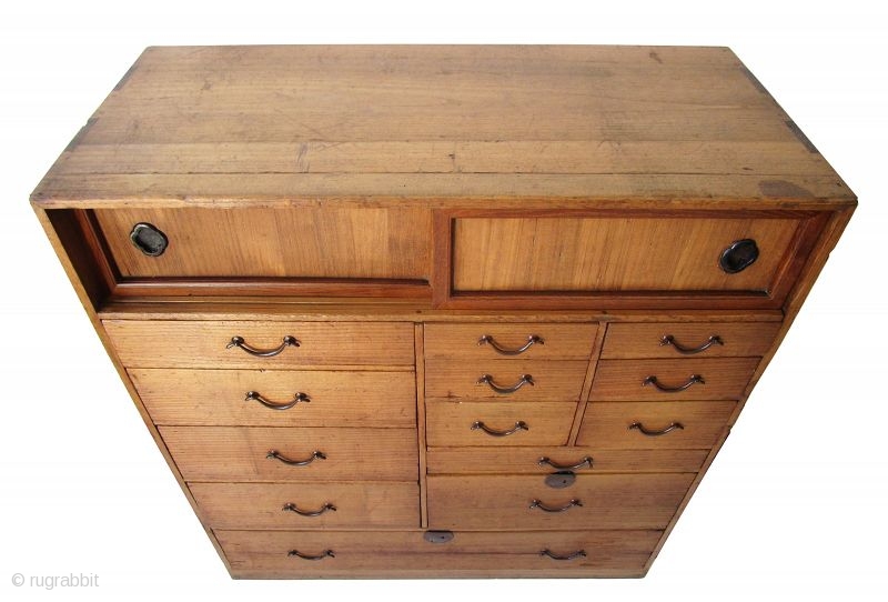 An antique Japanese Kansai Tansu in an unusual and unique multi-drawer design made of Kirinoki (Paulownia) wood. All original bronze hardware with straight dovetail joinery and using hardened wood nails in its construction. Divided compartment behind the sliding upper doors with wall separator allows for strength on its top where heavy objects can be displayed. Handles were designed in the Hirute style.
