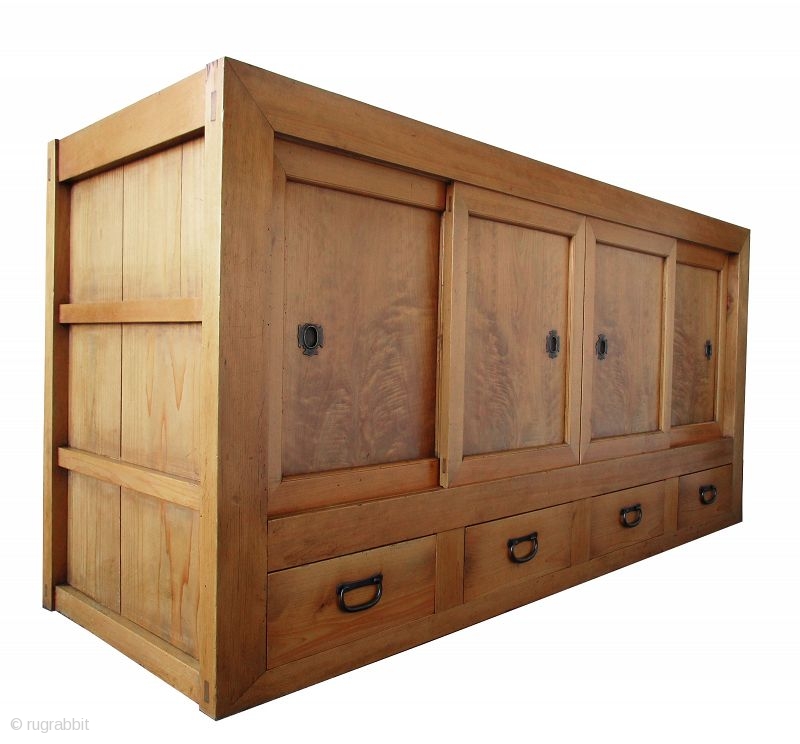 An antique Japanese 1 section Todana Tansu made of Hinoki (Cypress) and Suginoki (Cryptomeria) woods. Four sliding doors open to a spacious storage area behind. Four drawers along the bottom allow for additional organized storage below. Original hand made iron fittings complete this beautiful chest.
