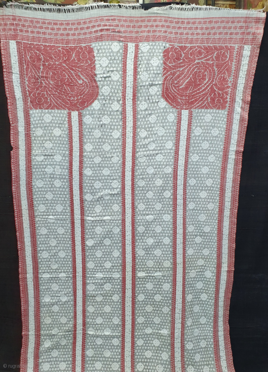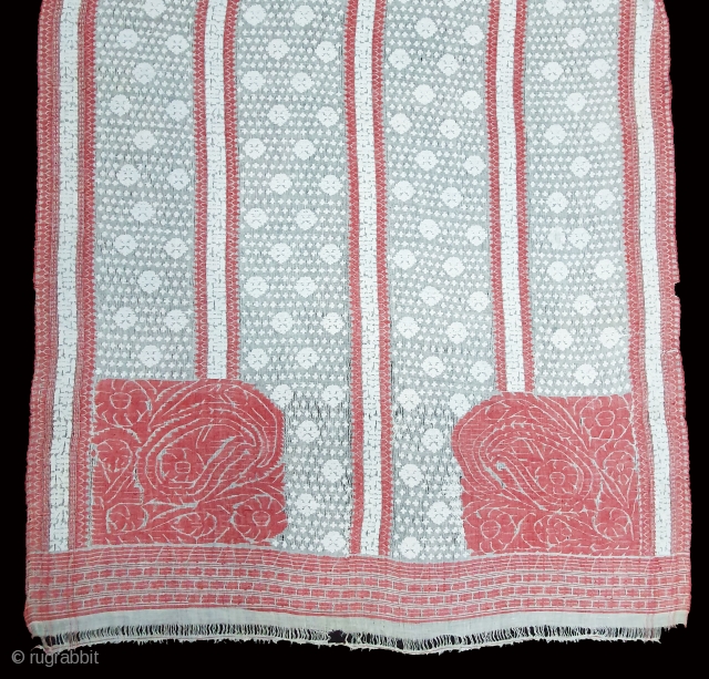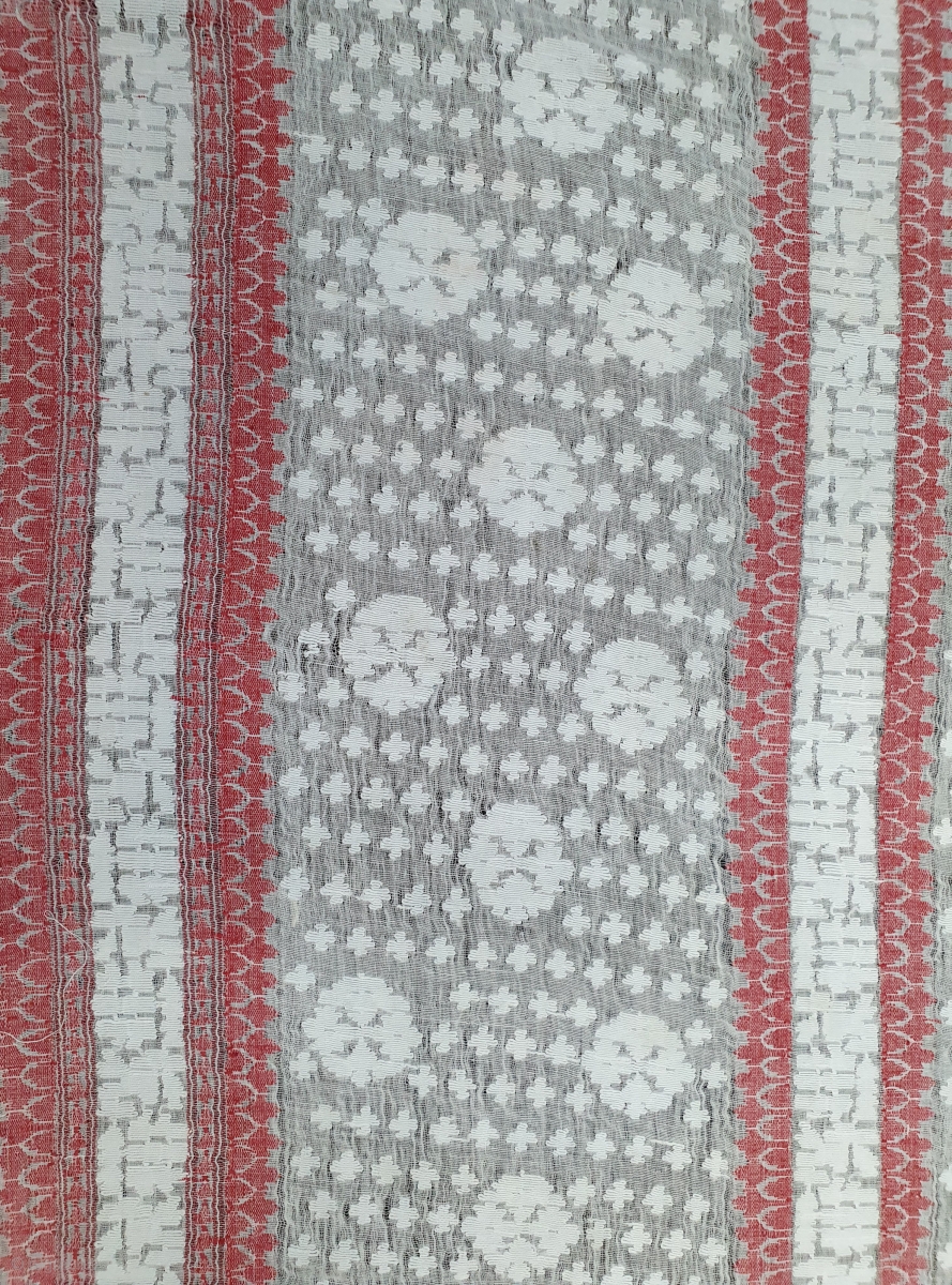 Paanch Paari (FiveBorder) Finest Muslin Cotton Saree,With Double Pallu,From Dhaka District of Bangladesh. Eastern India.India.Jamdani was originally known as Dhakai named after the city of Dhaka, Jamdani is Persian deriving name from 'Jam', meaning flower, and 'Dani', a vase or a container, named after decorative floral patterns found on Dhakai textile. Jamdanis are popularly known as Dhakai Jamdani or simply Dhakai. c.1900. Its size is 106X465cm (20200226_143223).