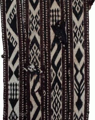 Very long antique Lori tent band 810x7cm. There is a small old cobbled repair, as shown. Some small areas of discolouration.