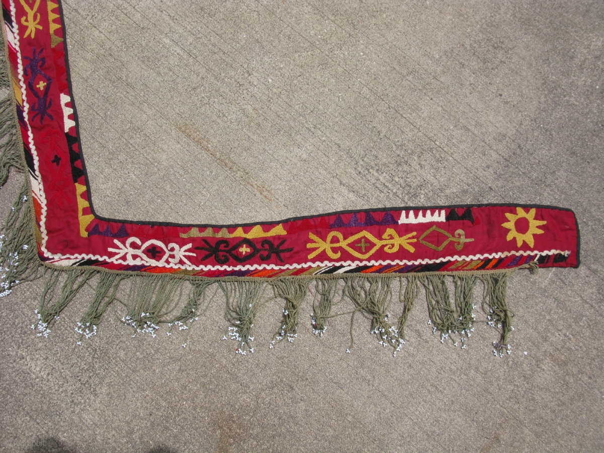 Antique Lakai embroidery, segosh with glass beads, Uzbekistan, early 20th century, the longest arm is about 34 inches long, suzani work, staining and color run, shipping in the us is $8.00