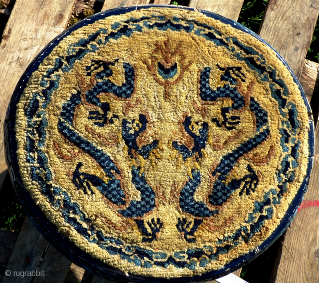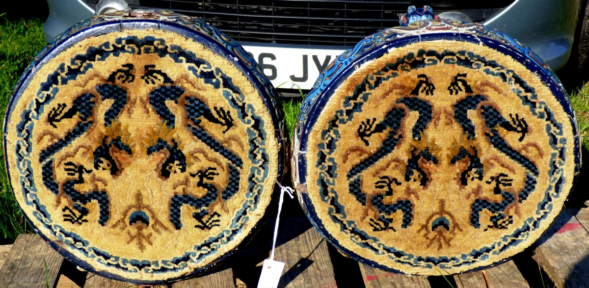 a pair of antique Chinese pile-woven covered marriage stools, old Ningxia covers on later painted wooden frames. Size of covers: 15 inches diameter or 37.5 cm Final photo shows how such stools form only part of the Chinese marriage ceremony, along with robes, hats, slippers, throne covers, thrones, etc