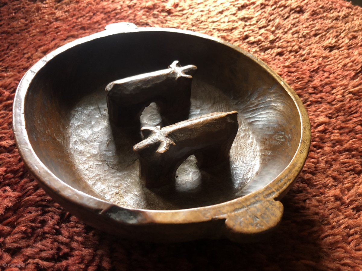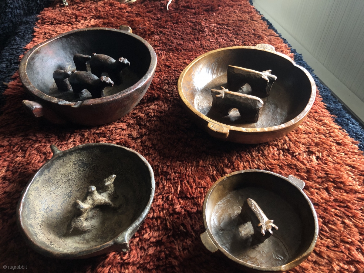 Altiplano ritual libation vessels. These were used in important ceremonies such as the "animal increase rite" which has its origins in the Pre-Columbian period. Each bowl is made in one piece - meaning it was laboriously carved from a single piece of very hard wood that would have been traded up from the lowlands. The vessel showing mating llamas is made from ceramic material. They all date to the 19th century or before, have excellent patinas and show ritual usage. These are genuine ritual pieces with true folk art appeal. They were made on the high altiplano of Bolivia at around 12,500 elevation. They were not made as commercial products, but were carved locally, usually by the very shaman who would conduct these rituals. The lone ceramic piece depicts mating Llamas, one wearing a bundle of textiles on it's back. The use of textiles in mating llamas is a well known tradition and shows the importance of textiles to the pastoralist, Aymara society. The smallest of these shows a single bull with a snake carved on its back and coming out of its eye. At some later date another snake was carved into the floor of the bowl. The largest vessel is 11 inches in diameter, the smallest - 6 inches. These are available individually or as a collection at a group price. Old examples like these are rare and these are a select group.