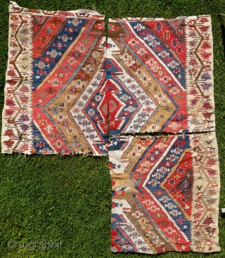 3 Anatolian kilim fragments, 1850-1870, beautiful old colours, 4 shades of red including cochinel and the queen of madder dye, a mellow, rosy, rasberry red, deep violet and fresh spring green. Very finely woven and soft. The white in the field is plied cotton and wool. Gently washed, condition as to be seen.