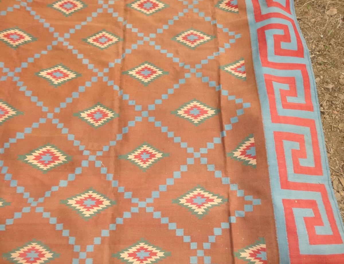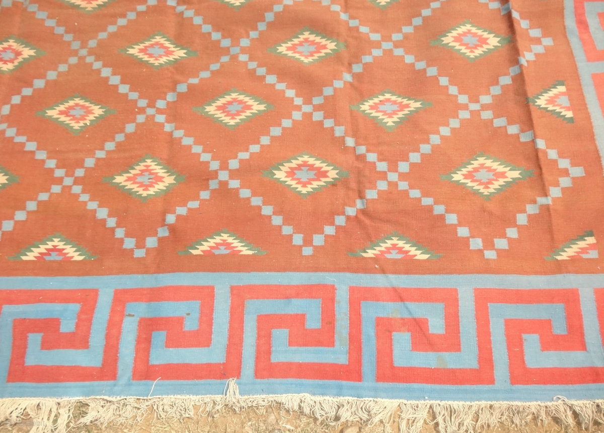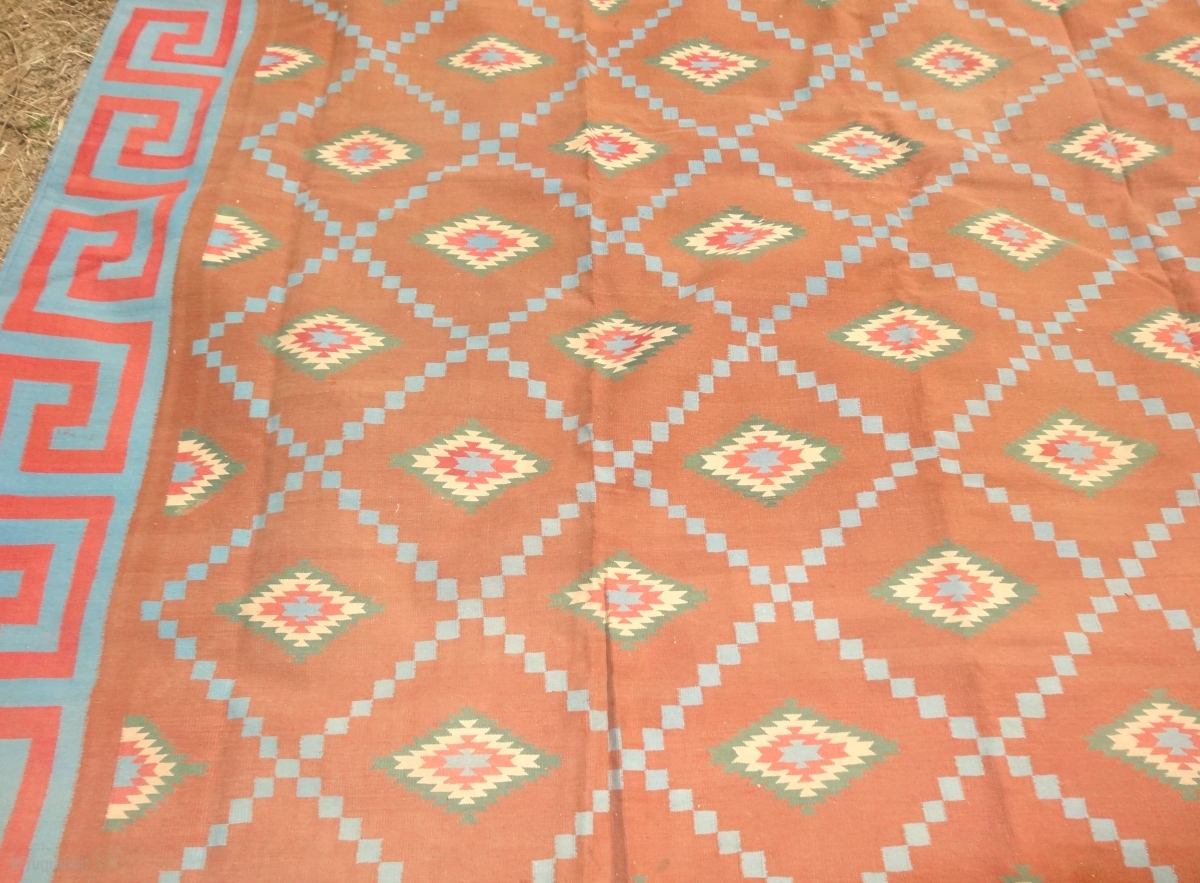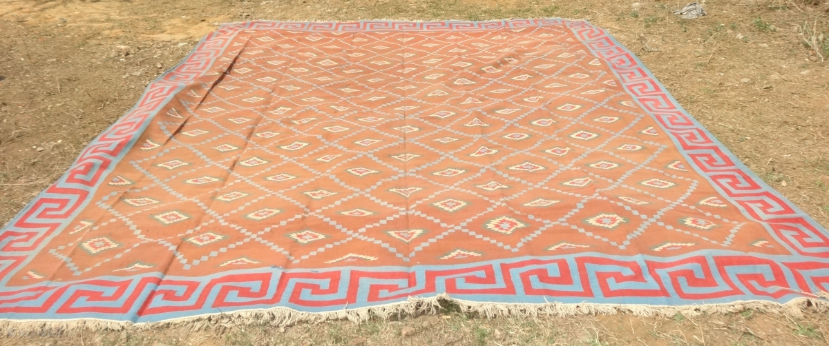 Jail Dhurrie(Cotton) Blossom Dhurrie with stepped Diamonds Design with key Border From Bikaner, Rajasthan. India. c.1900. its size is 400cmX475cm (Large Size). It’s only used for some Festival time (dsc05155).