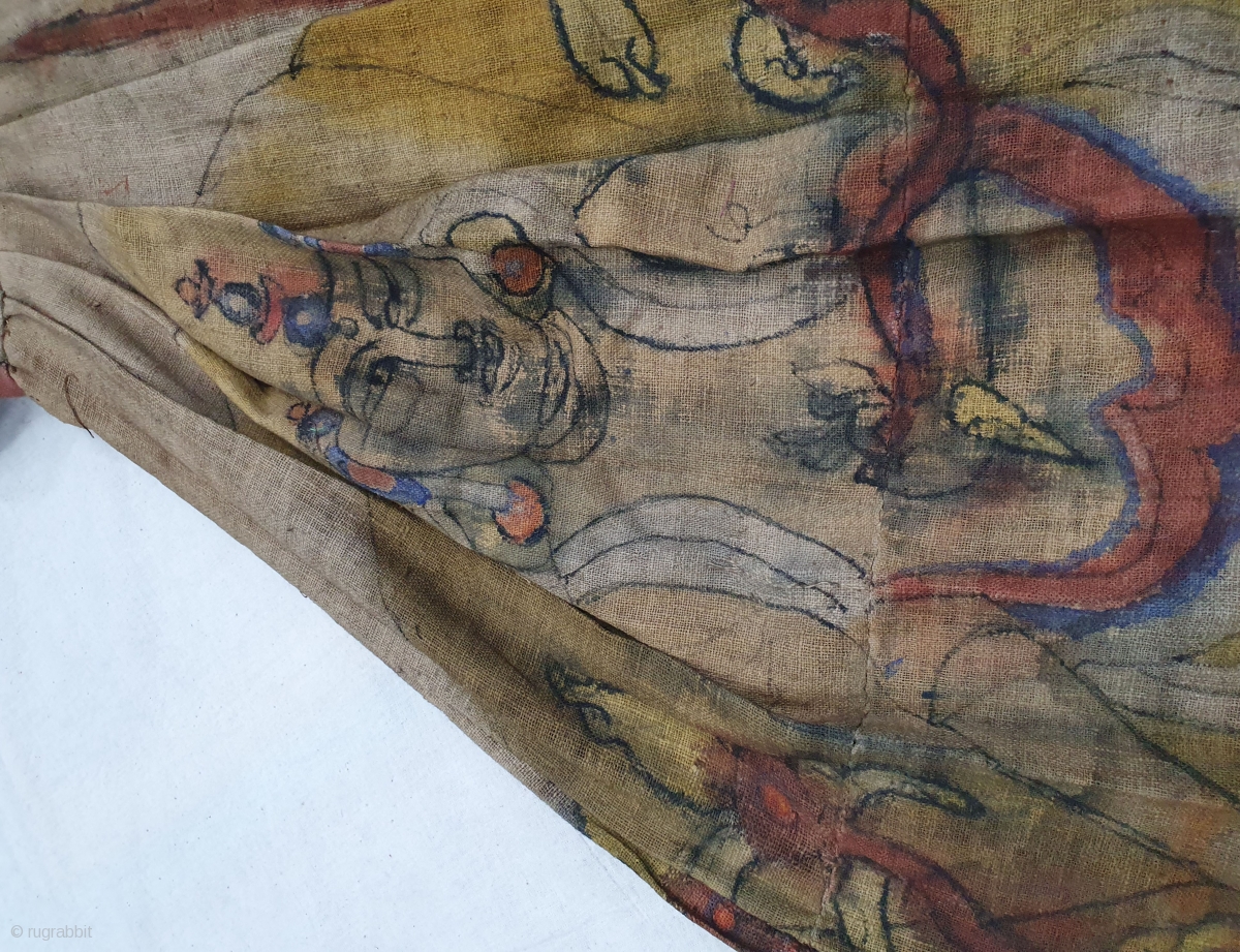 The robe was probably worn on religious festivities by a holy monk. It is hand painted with images of Bodhisattvas such as Avalokitesvara the compassionate and beautifully decorated Chortens.It's Size is L-155cm,W-45cm,S-25cmX72cm,Round-390cm (20200212_175010).