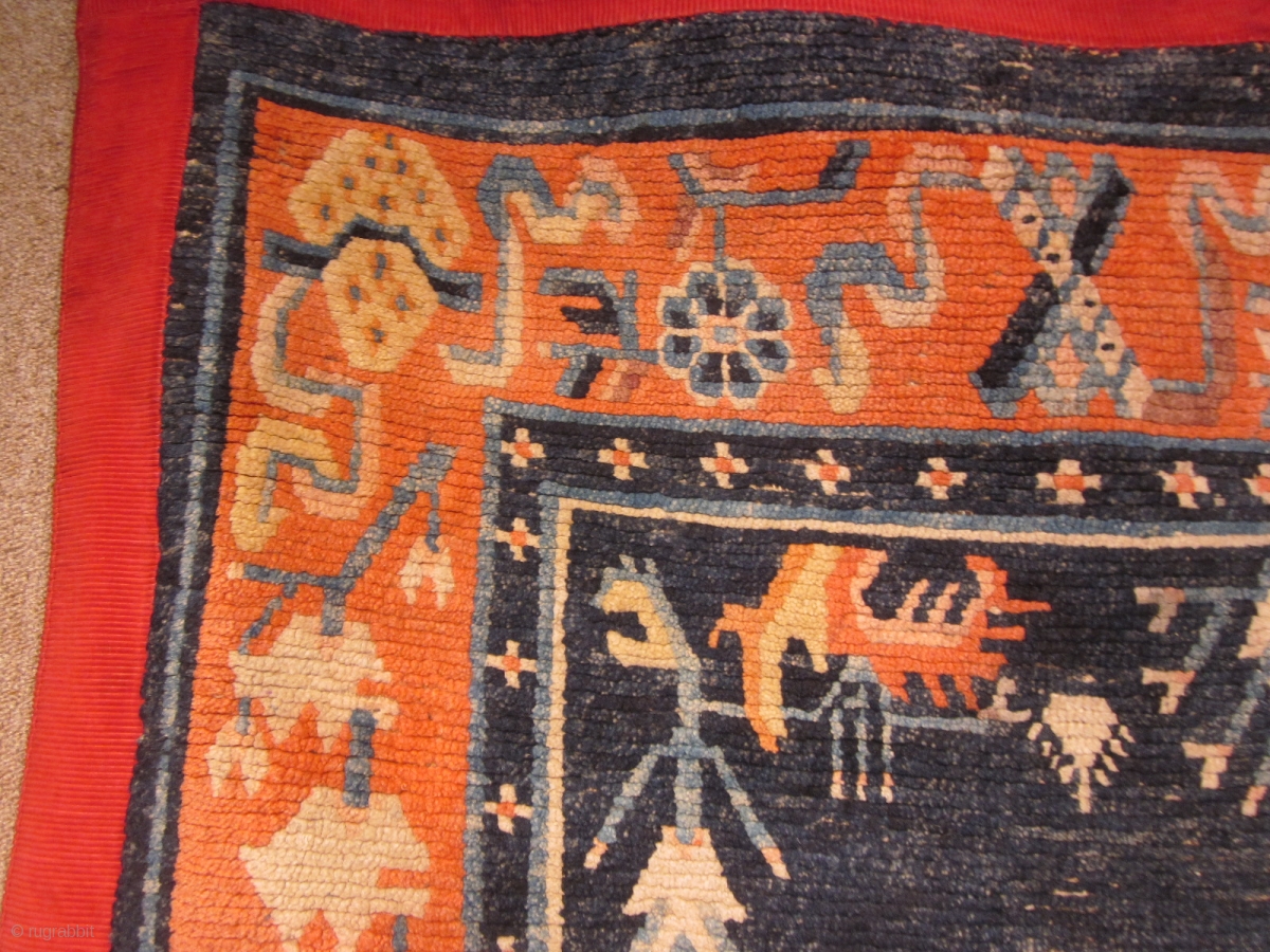 Tibetan: Long runner, 35 by 88 inches, three "coin" design, with floral elements. c 1930, red corduroy surround.