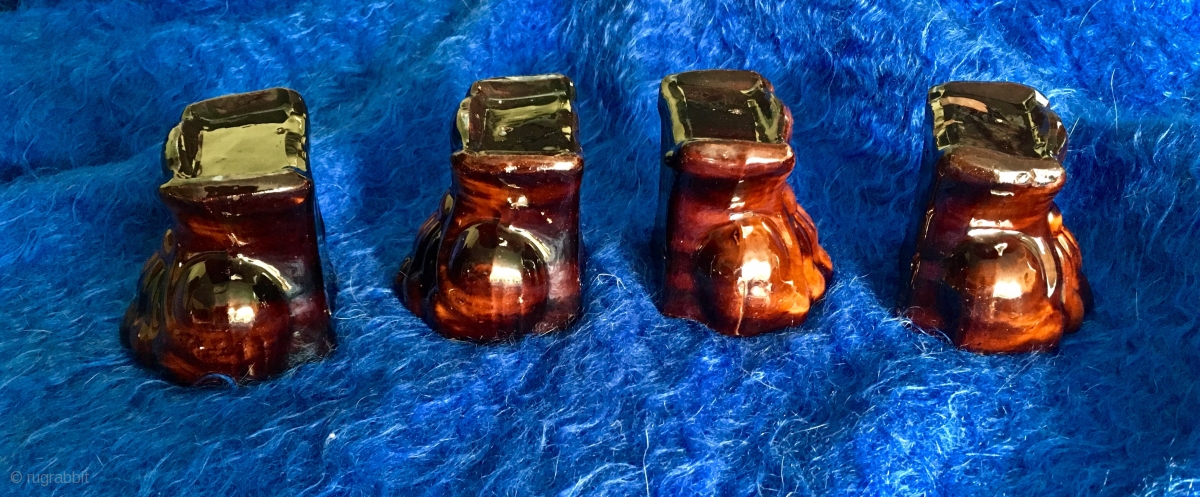 a very rare 19thC set of four glazed Redware Window Stops or Furniture Lifts in the form of Classical Stylized Claw Feet or Lions Paws covered in mottled lead & manganese glaze 3-3/4"w x 3-1/2"h x 3-3/4"d Over 1lb each