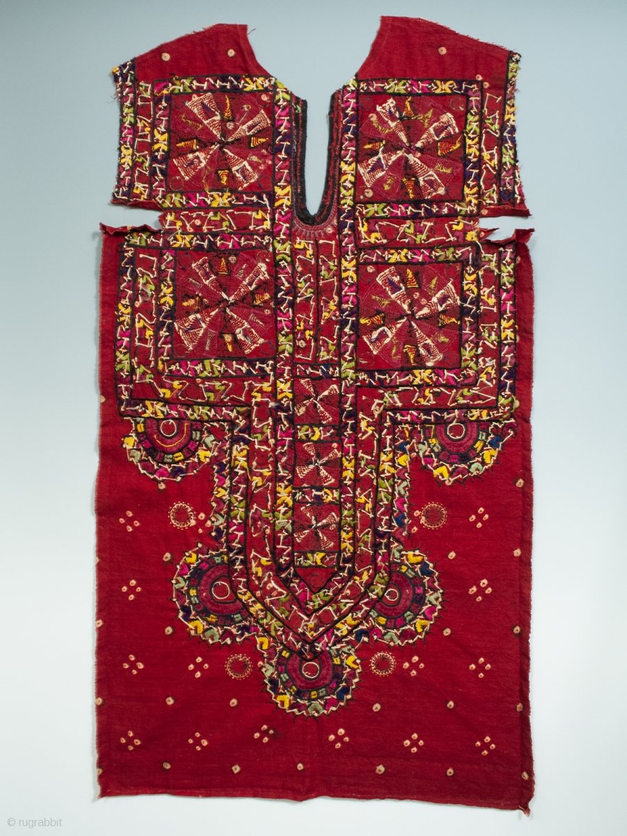 An embroidered shirt front from the Sindh region of Pakistan. Deep red cotton with some tie-dyed dots covered with silk thread embroidery and mirrored disks scattered throughout. In great condition with all mirrors in place. Likely mid-20th century or earlier. 33.5" by 18.5".