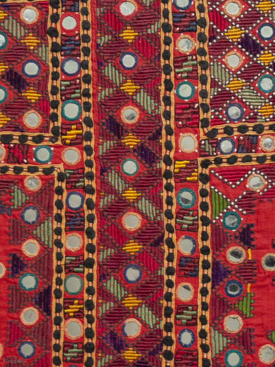 a multi-colored embroidered shirt front from the Sindh region of Pakistan. Bright red cotton is completely covered with silk and cotton thread embroidery and mirrored disks scattered throughout. In great unused condition with all mirrors in place, it is lined in green cotton. Likely mid-20th century. 31" by 19".