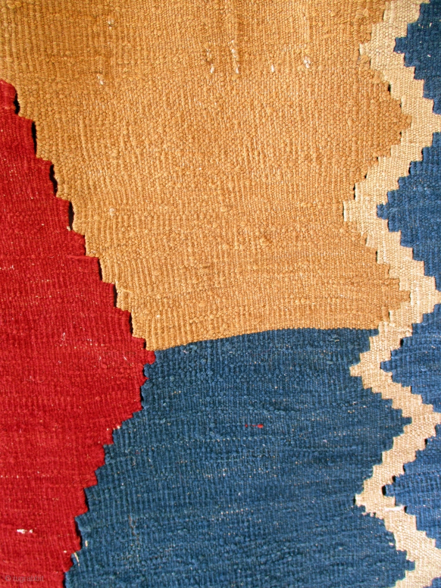 gabbeh kilim - a simplistic and bold flat weave which will make a dramatic contribution to modern decor. It is in perfect condition and lies totally flat. Use it on a floor or over a bench or bed as a throw. If space permits it will make a powerful wall hanging. Reference 3320. Size 250 x 151 cms., or 8ft.3ins., by 5ft. Euros 345.