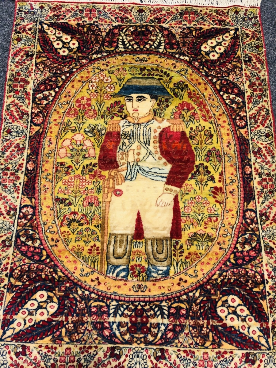 Fine antique Persian Kirman pictorial rug displaying Napoleon Bonaparte. Size: ca. 87x62cm / 2'9''ft by 2'1''ft