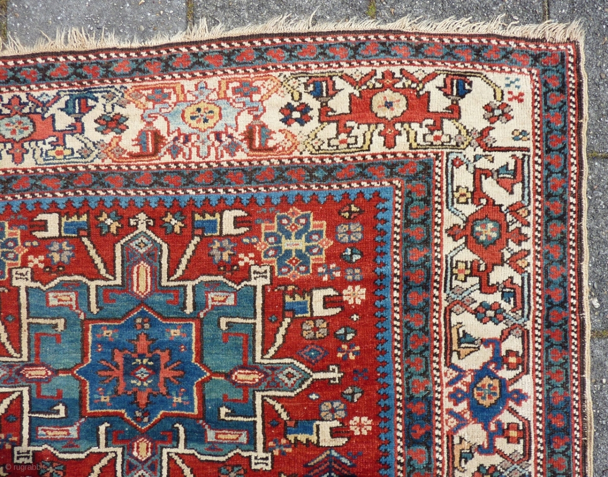 Nice Antique Karaja wool-on-wool rug, ca. 1900, 199/192 cm. x 144 cm. with a Caucasian Eagle or Sunburst medallion, in all over very good condition with well saturated all natural dyes. Endings secured. a slight loss at one corner and a bit out of shape (some length difference between left and right side). No repairs, or damages.