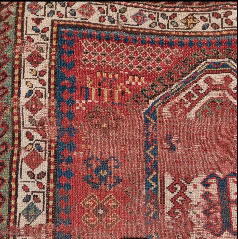Masculine Sevan? Kazak, worn but actually quite a nice antique rug with personality, color, and a nice handle. 4'4"x7'4"