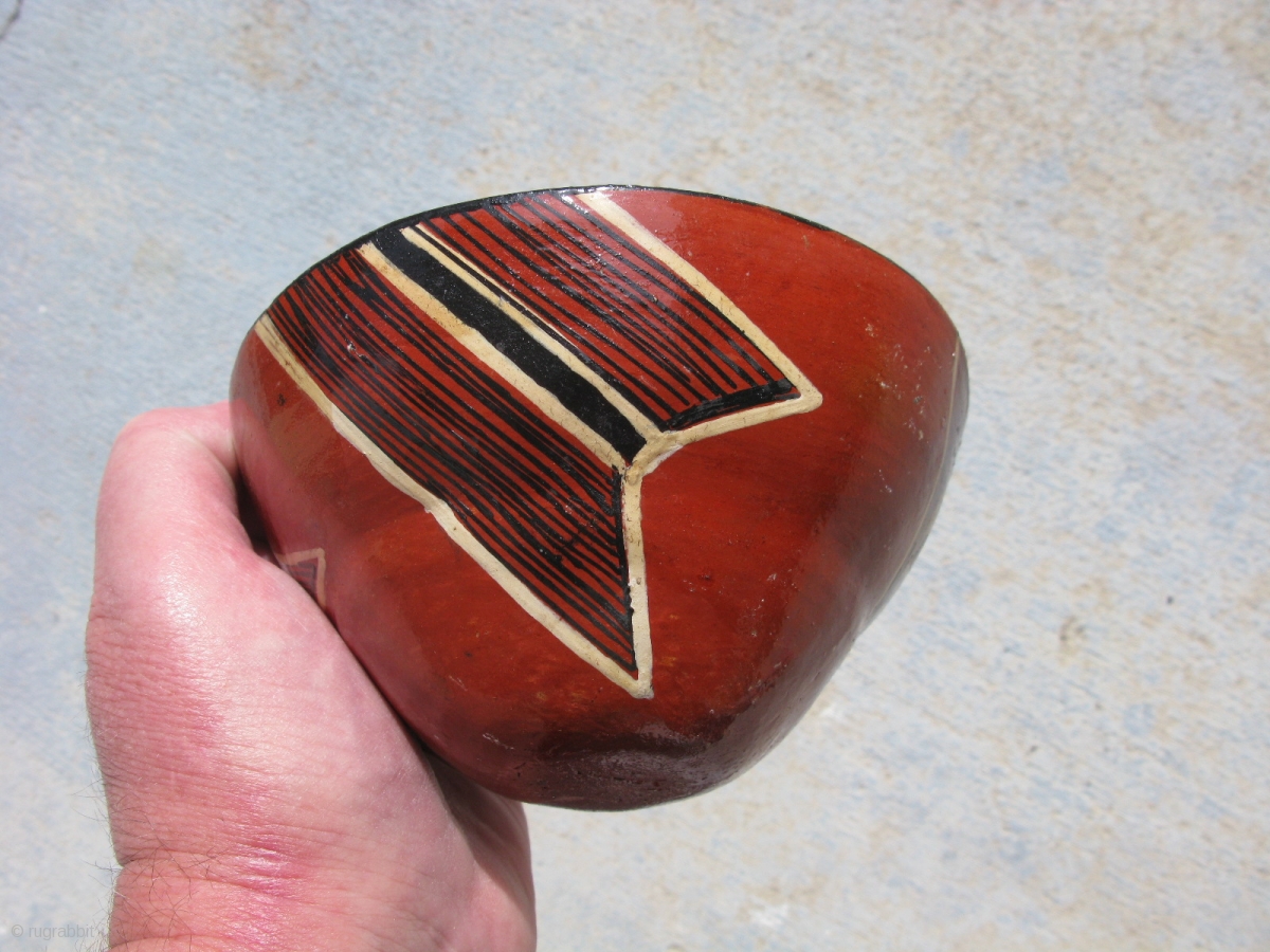 Vintage Mucahua pottery bowl for Chi Cha drink, Quichua Indians, ( Kichwa Indians ), Ecuador, Amazon Rainforest, fine line hand painting, lacquered with tree resin, i bought this from a woman she said her mother made it, she was adamant to correct me in my pronunciation, she said the Quichua People live in the forest, and the Quechua People live in the mountains, both Peoples were once part of the Inca Empire, minor dings, the approximate size is 5.5 inches across and 2.5 inches tall, #2756b, shipping is extra