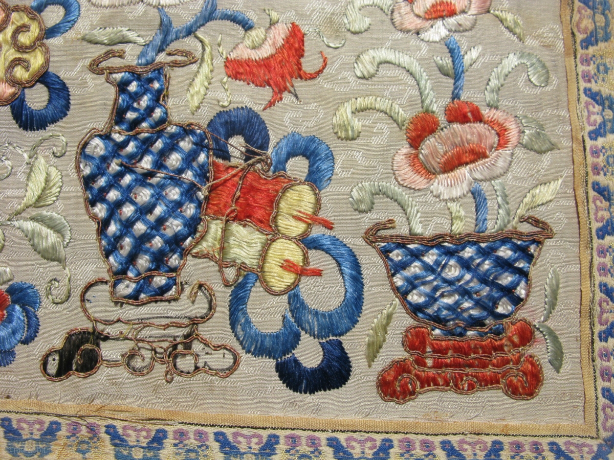Antique Chinese table runner / alter cloth, hand embroidered silk on beige silk damask with cloud motifs, embroidery techniques include satin stitch, long and short stitch to create color shading, couching of metal threads, and a small amount of "forbidden stitch", the design is interesting, in the lower left corner is an offering plate, with a peach and a hand of Buddha fruit in it, a pomegranate is featured in the central vase, together these represent the "three fortunate fruits" and symbolize abundance and plenty; there are four types of flowers issuing from the central vase all from the same stem, these are the blossoms of the four seasons; above the offering plate is the wheel of the law, and next to the central vase sit scholar's scrolls, the minor border is butterflies, the main border is silk brocade with phoenix birds, i think the main border is not as old, and probably replaced the original border, it is backed in yellow silk, the approximate size is 14 inches wide by 13.5 inches tall, there are missing silk threads and loose metal threads, minor staining, the base silk damask is tattered and splitting between the two borders both top and bottom, the textile needs to be handled gently to prevent further damage, it would be beautiful framed which also would help to preserve it, #7180, shipping is extra