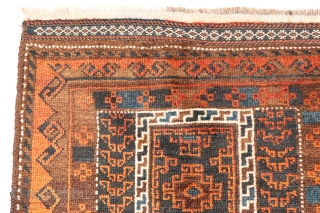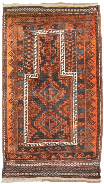 Baluch prayer rug from South West Afghanistan, with an unusually wide border. It is finished off with two large kilim skirt ends. All the dyes are natural, with a lovely blue colour, and the wool is soft and shinny. 139x78 cms. a1802017. You can purchase this antique prayer rug directly from our web: https://nomada.biz/en/producto/antique-baluch-rug-from-afghanistan-139x7...