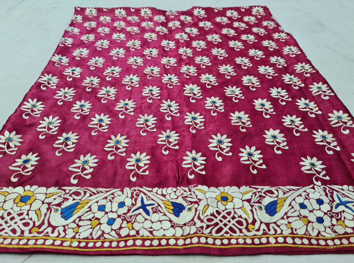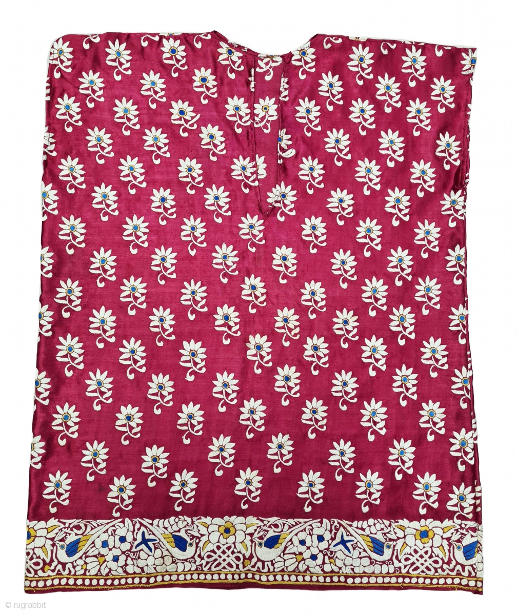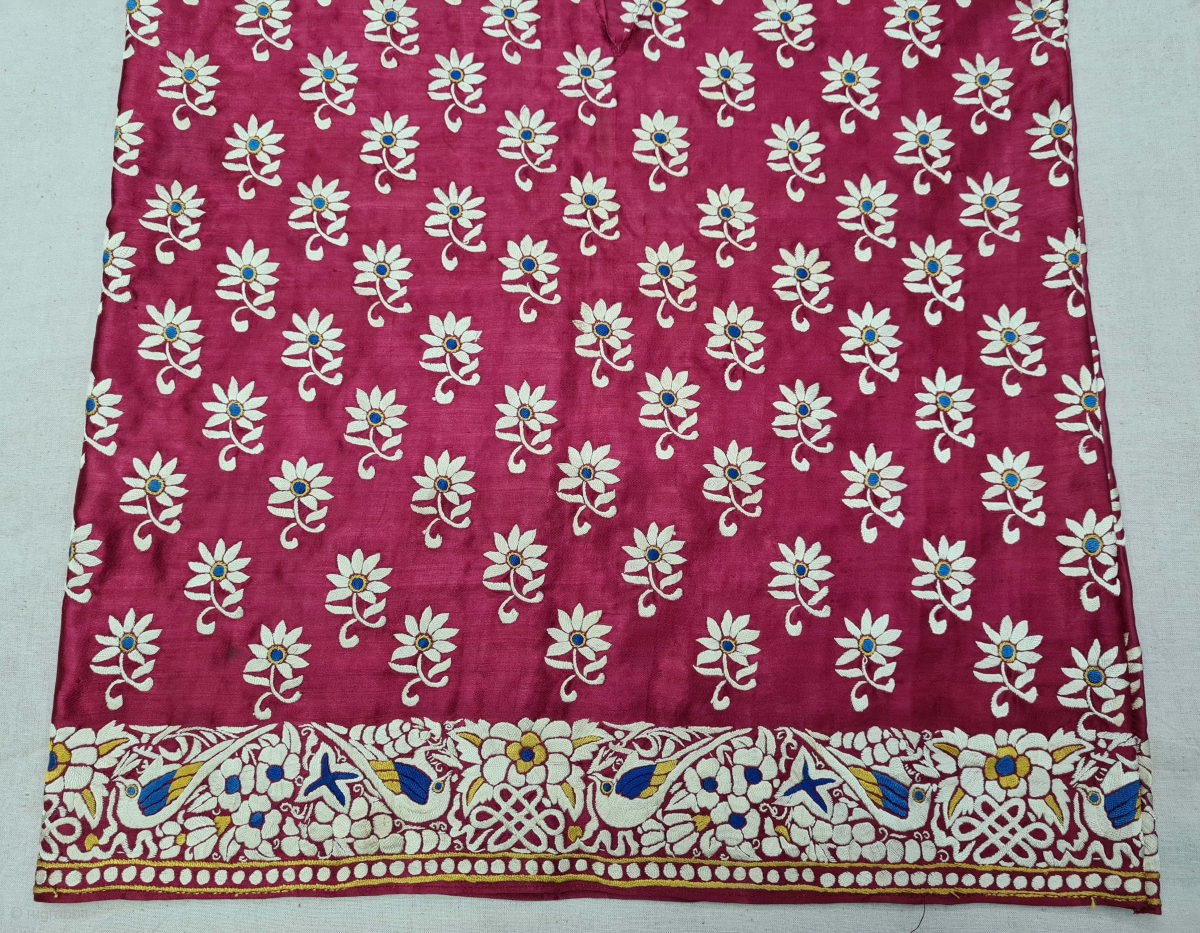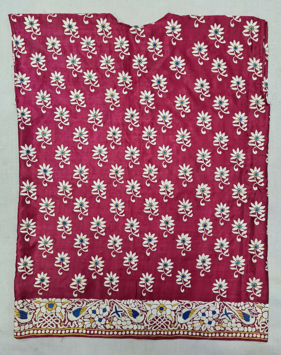 Parsi Jhabla or Jhablo (Blouse) From Surat Gujarat India. The ‘four over, under one satin weave is embroidered with Brids and Flowers design.This kind of Jhabla were embroidered by Chinese artisans in the town of Surat in Gujarat for the Parsi women of that region.The Parsi's are a Zoroastrian community in the Indian subcontinent. They are non Muslim Persians that were driven away from Iran when it became Islamic.