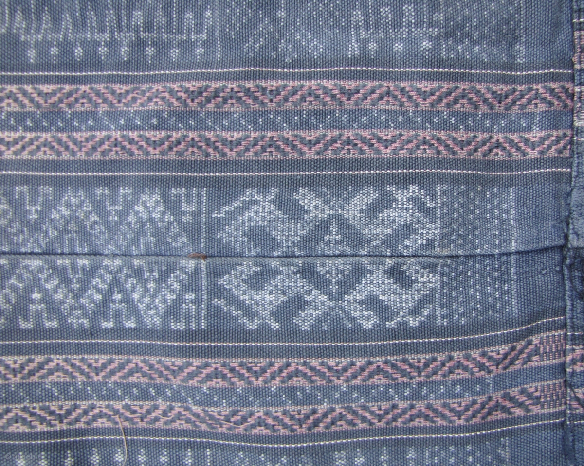 Fine and rare five paneled skirt, from the Meifu subgroup of the Li people Hainan Island, circa mid 20th century. This kind of ikat textile is unique among Chinese minority groups. i would date this 1950/1960) is hand spun cotton and indigo with abstract human and animal designs. Superb condition with no holes or frays, there is one stain noted in enlargement 2 (could just be a bit of brown thread though). l: 102cm/ 40in and h: 59cm/23in (stitched together) x 2 for total size. Reference Traditional Brocade of the Li Ethnic Group: Fu Guihau.