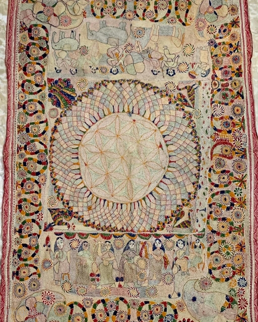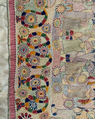 Vintage fine museum quality Kantha from undivided Bengal 19 century of Murshidabad district with fine needle embroidery on multiple muslin layers with all geometric and figured work. The size of this Kantha is 139 x 95 cms .