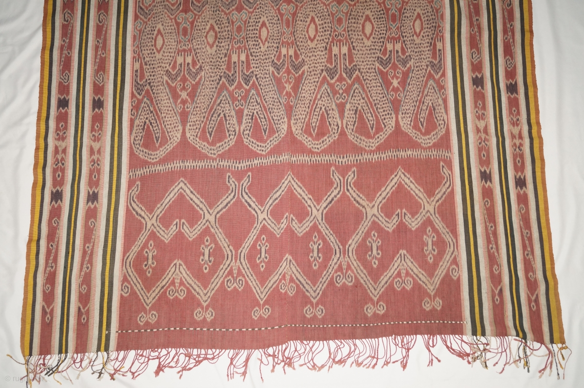 Fine Pua Kumbu ceremonial cloth Iban Dayak people Borneo Sarawak with Buah Baya / Crocodile motif, possibly from Saribas system, 19 - early 20th century, Cotton Ikat natural dyes. size: 203 cm x 124 cm.