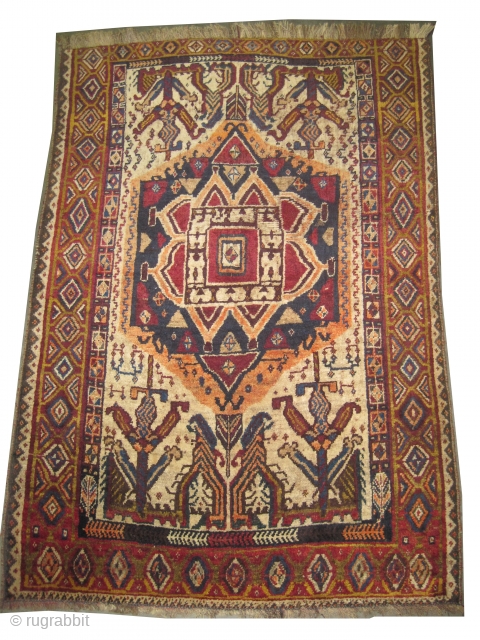 The black knots are oxidized. The knots, the warp and the weft threads are mixed with hand spun wool and goat hair, the selvages are rolled on one line with two different colors, from up edge the last tiny border is missing, high pile, soft as an handkerchief and high standard quality, unique example and in its original shape.