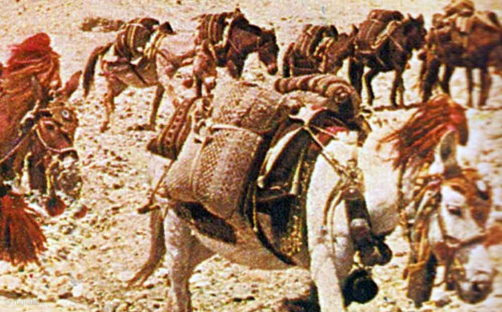 Old Tibetan horse trapping known as a 'takyeb' and used for decorating the forehead of a horse, yak or dzo (a cross between a yak and a cow), often seen on the lead animal/s in a Himalayan pack train (as seen in the example above). It features a simple flower motif as its central design, has the remains of its upper leather 'tie down' straps and as was the common practice it is backed by cloth (which was replaced as needed over the years when worn out from use). Circa early I900's, fine hand spun wool warp and weft with all natural dyes. Size 23cm wide x 21cm high (9in x 8.25in).