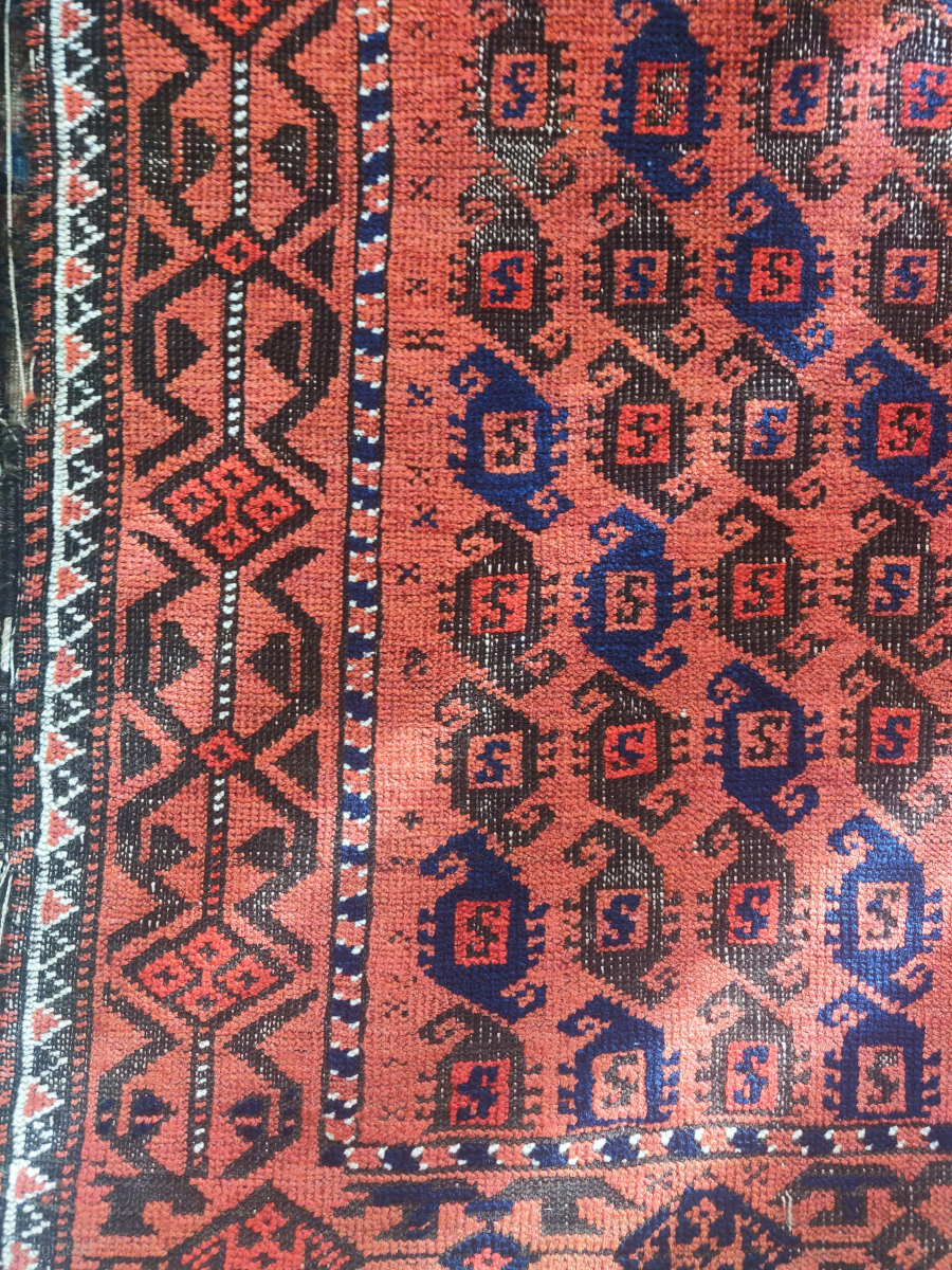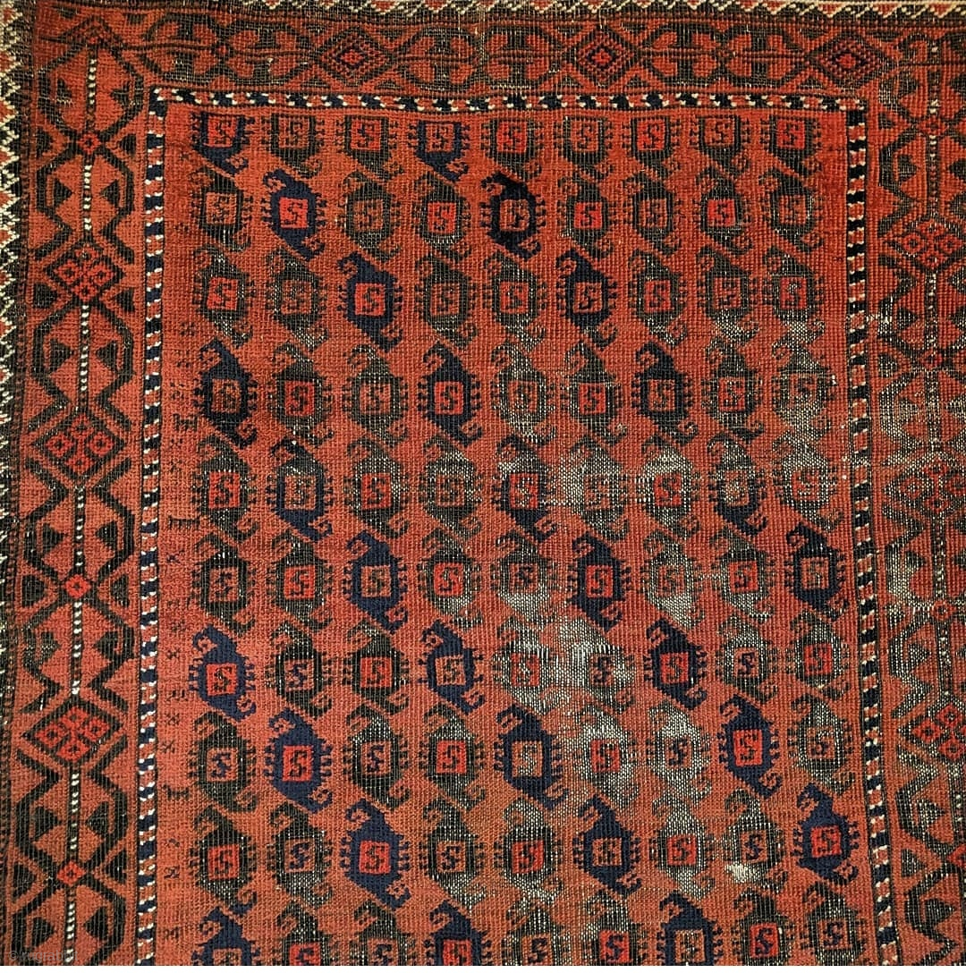 Small cinnamon ground Baluch rug with a 'scorpion' boteh field.