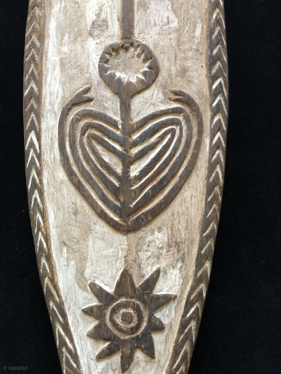 Papua New Guinea Spirit board (gope). Size: 26 x 5.5 x 2 inches. Wood plank carved in low relief. Applied white lime with traces of red ochre remaining.