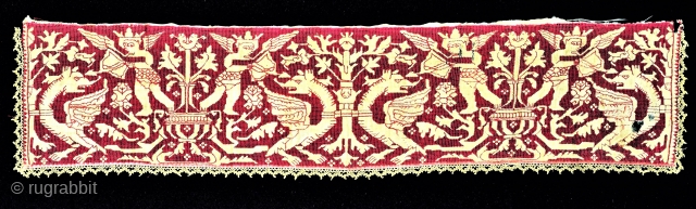 Rare and fine border of a towel with original lace edging, silk open-stitch embroidery on linen ground with mythical Classical themes, exquisitely rendered. Circa 1600. Abruzzo in Sicily. Its imagery is identical to a panel in the Poldi Pezzoli Museum, Milan. No repairs. Very small losses according to its age, now conserved. Approx 28 x 7 inches (71 x 17 cm). Provenance: Alberto Boralevi, Florence, in the 1990s. For more details, contact dennisdodds@juno.com