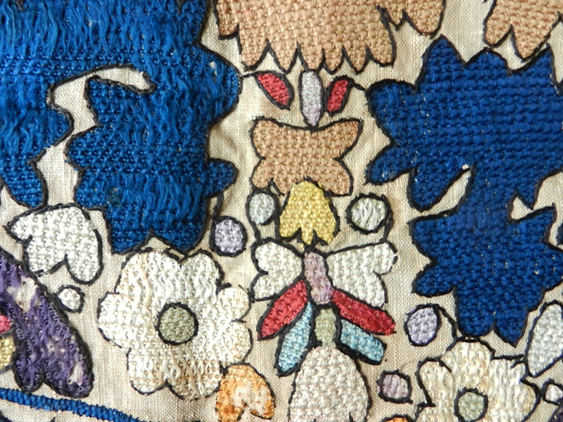 Thansifa fragment cod. 0814. Silk embroidery on cotton. Tetouan area. Morocco. Early 19th. Century. Good condition. Dimension cm. 63 x 41 (25” x 16”).